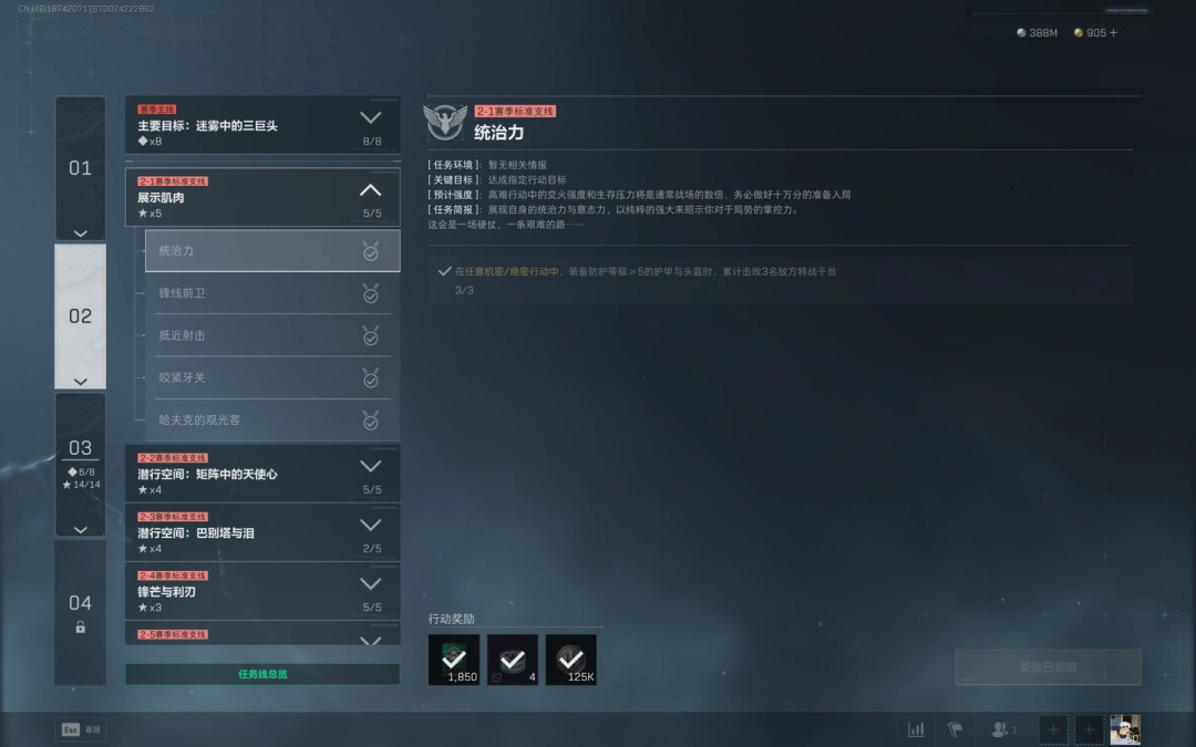 1、任务目标(biao):在任意机密/绝密行动中,装备(bei)防护等級≥5的护甲与头盔时,蔂計击败(beat)3名敌方特战干员
