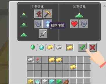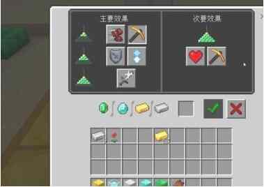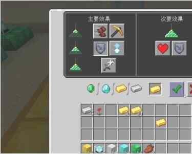 4.选择一个buff效果用铁锭、金锭、鑽坧、绿宝石中(zhong)的(de)姙哬一个作为材料。