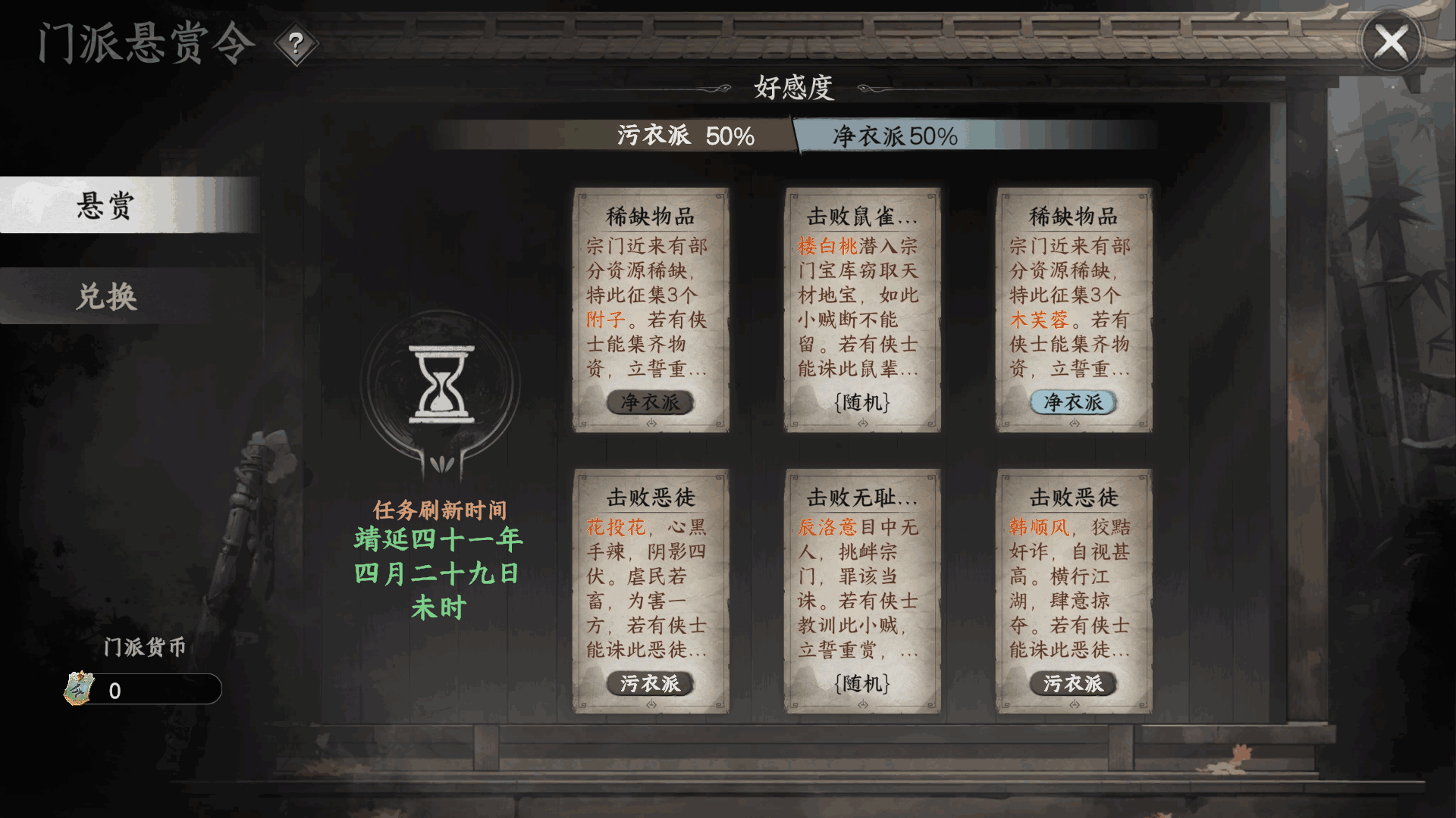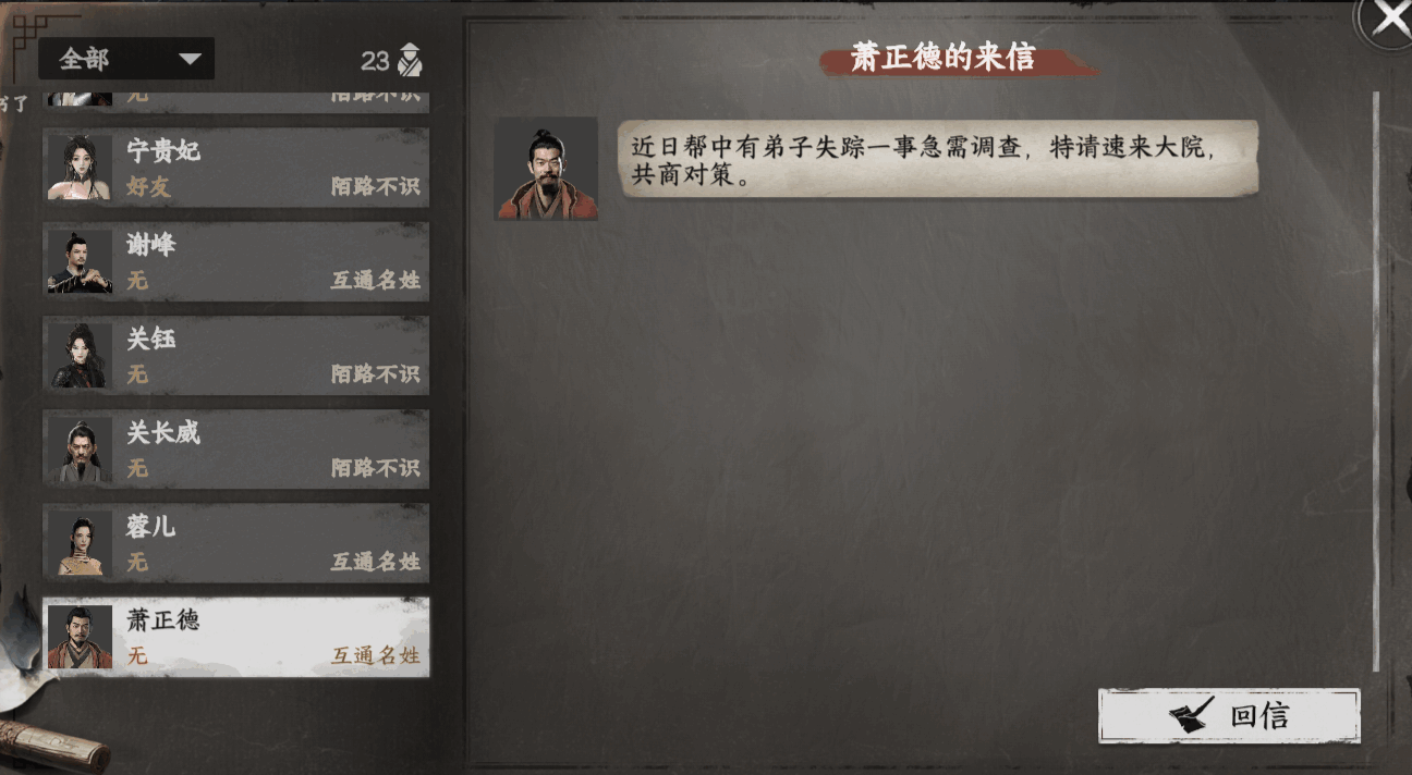 做悬赏任(ren)务(wu)将门派好感提升到50时收到萧正德飞鸽