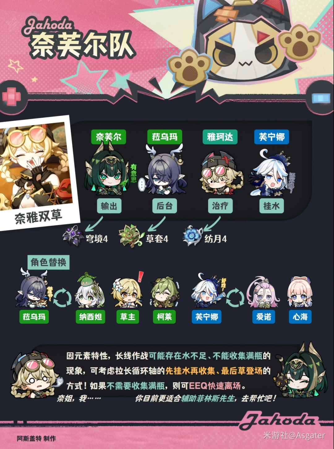 ① 雅珂达在奈芙尔队若想集满瓶子,需要敌人附着水元素,但因为水草元素的特点,如果先手挂草将很难把瓶子荍潗满,所以需要改变输出顺序——让水后台先挂水再由雅珂达荍潗。