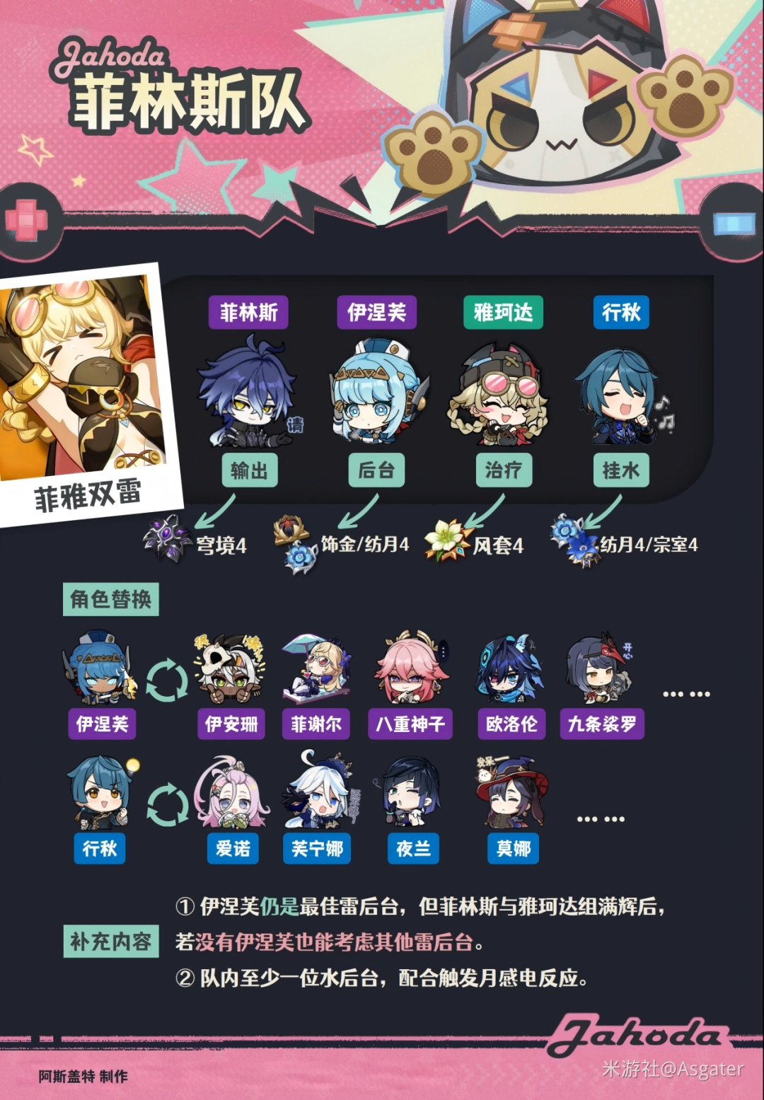 ② 菲林斯优选凑双雷共鸣优化循环,伊涅芙仍是最佳雷后台(护盾、月感电输出、精通提升等)。
