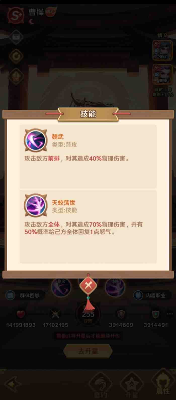 曹操在魏国阵营当中,他其实可以(keyi)对敌人前排造成物理伤害(harm)。不过玩家要注意,这种物理伤害(harm)相对较为基础,但是(danshi)却能够稳定的输出,而他在施展技能(skill)的时候(shihou)能够给所有的敌人造成70%的物理伤害(harm),并且还是(still)可以(keyi)具备一定的概率(probability),能够恢复自(zi)己队伍的怒气值,其实这种怒气值能够有效的强大输出能力,还能够提高整个团队的技能(skill),并且在循环方面的速度也會有所增强,最终能够持续性的作战。