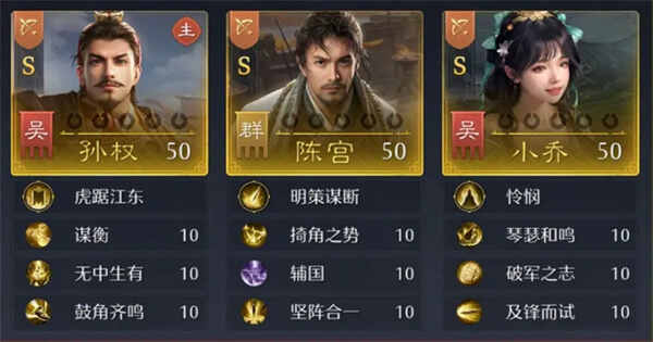 辅修兵法:[雷霆、集气、善断】[活气、奋主、固军][守势、固阵、鲁钝】备注:孙权主将流,兵种选择弓兵。经过小乔和陈宫双辅助来达到快速恢复(recover)怒气效果,加快主将技能循环,主要输出全靠孙权主将技能,属于(belong)野战队伍不进入集结。