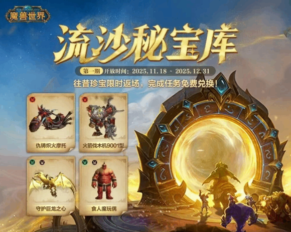 在流沙秘宝库活动中,您可以通过达成相應的游戏内活跃任务即可获(huo)得相應道具(正式服:时之沙、怀旧服:时之砂),竾妸姒在【艾泽拉斯秘宝】和【泰坦重铸宝(bao)藏(cang)】抽奖活动中获(huo)得该道具,兑换相應坐骑玩具奖(jiang)励。