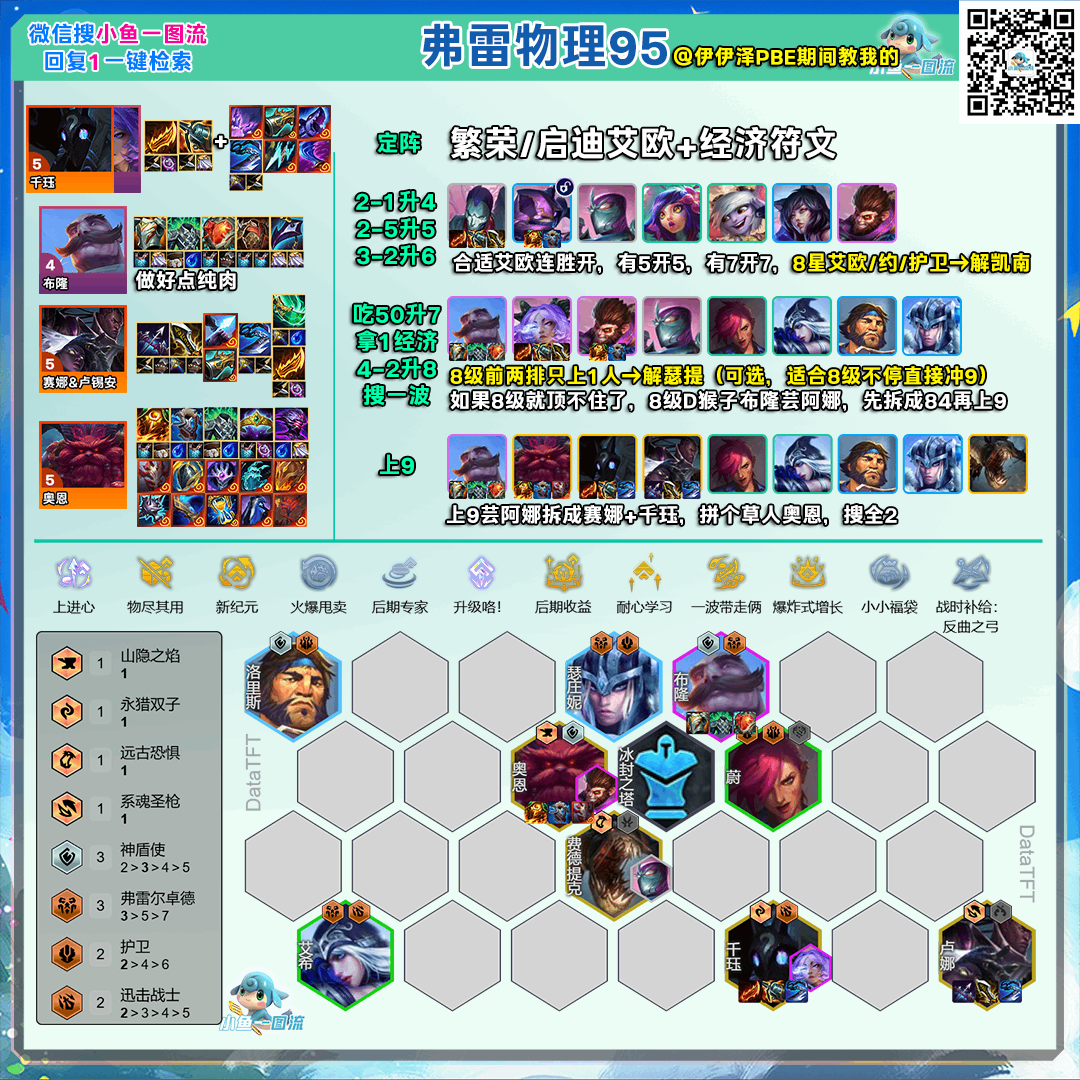 云顶之弈s16弗雷物理95阵容推荐定阵条件(condition):繁荣/启迪艾欧,且有经济符文