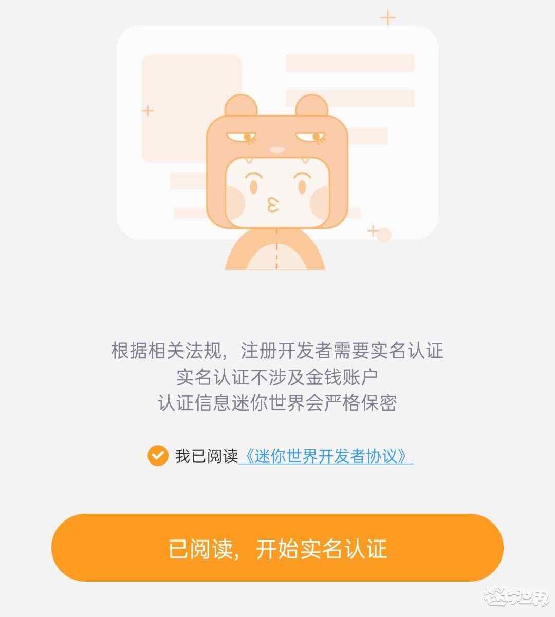 首次进入开发者中心需要进行认证,冒险家们阅读《迷你世界开发者协议》之后,勾选并点击开始实名认证。