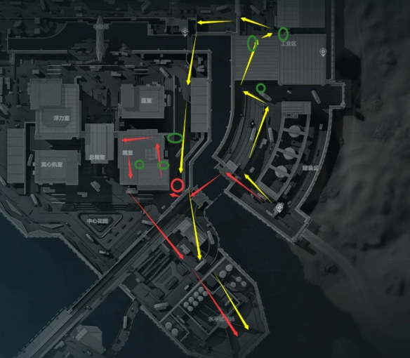 出缺口时一定要封烟(红圈位置)过,防止员二抽你,到黑室门口时进门先peek一下看看(绿圈处)有没有人蹲你,没人进门爽吃,注意靠近密码门的这一侧桌子上会刷红,二楼黑室核心门口桌子上和地上(shang)也会其刷大红。