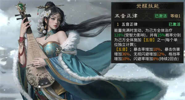 觉醒技能【五音正律】:充满50能量时发动,治疗己方全体,并有25%概率施加【五音】之一(每个单位独(du)立(li)计算)