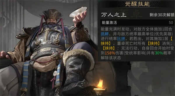 觉醒技能【万人之上】:充满50能量时发动,挑衅敌方全体,与敌方统率最高单位(优先英雄)进行统率比拼,若胜出,对其施加1层【挟持】,董卓死(si)亡时所(suo)有(you)【挟持】消失。