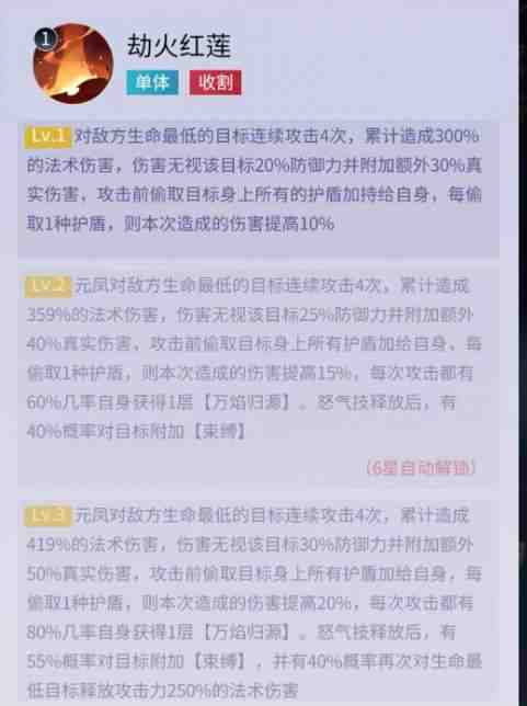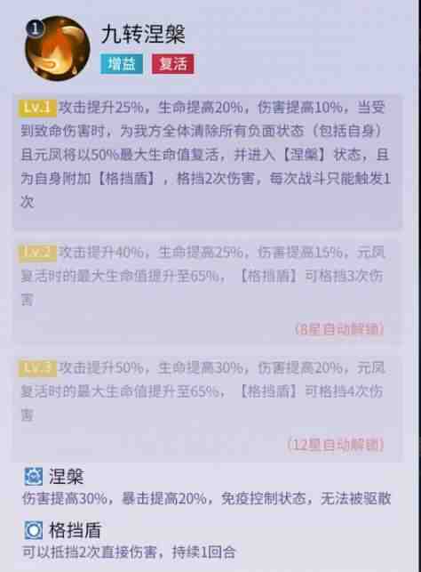二技能在战斗开始时给我方全体添加一层凤羽效果,并对敌方全体造成一次伤害,当伤害可无视护盾,且给元凤对位的目标附加焚心,降低其受到的治疗效果,增加受到的伤害,风羽这个效果可以提升最终伤害,加强我方全体输出。被动技能除了提高(gao)攻擊、生(sheng)命(ming)和伤害之外,当元凤受到一次致命伤害时,为我方全体清除负面状态,同时自身还能复活,这样相当于多了一条命性,容错(rongcuo)率相当高。