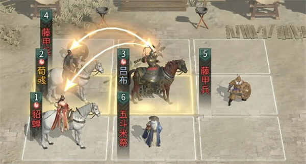 兵种站位:在吕布的前方和荀彧的上方各放置一名藤甲兵,在貂蝉前方放置一名五斗米祭。