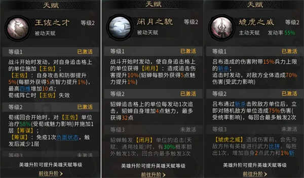 主动技能固定携带【鼎力相助】,使追击格单位获得10%伤害加成,每额外5的魅力提升(promote)1%,貂蝉天赋自带30点魅力提升(promote),搭配上提升(promote)魅力的宝物,能获得接近20%的增伤效果。
