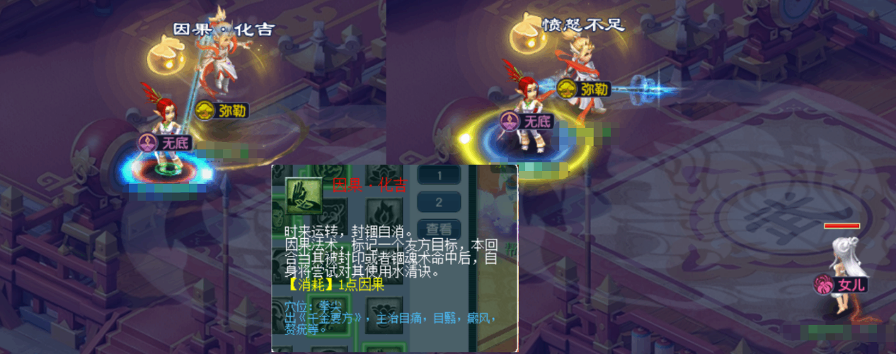 「因果·化吉」被动触发的「水清诀」需要(need)玩家携带水清诀特技(trick),且依然需要(need)消耗自身(shen)愤怒,当自身(shen)愤怒不足的时候,「因果·化吉」将无法(wufa)利用(use)「水清诀」被动解除本回合可能遭遇的封印法术或锢魂术。