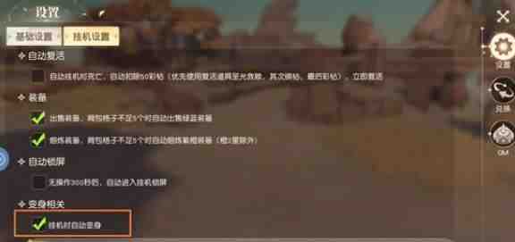 想要开启天神系统,技术是比较便捷的,只需要点击主界面右下角的天神按钮,就可(ke)以进入到其中。zheli就有一个小细节(jie)需要注意,默认状态下自动战斗并不会触发天神变身。想要让挂机流程更加的高效,记得在设置界面的挂机选项中,直接选择挂机时自动变身,同时在基础设置里面的自动复活,還有装备出售都需要同步配置。例如背包格子不足5个时,就会自动的出售绿蓝装备,可(ke)以让挂机的过程更加的省心,把所有的注意力都放在战斗上。
