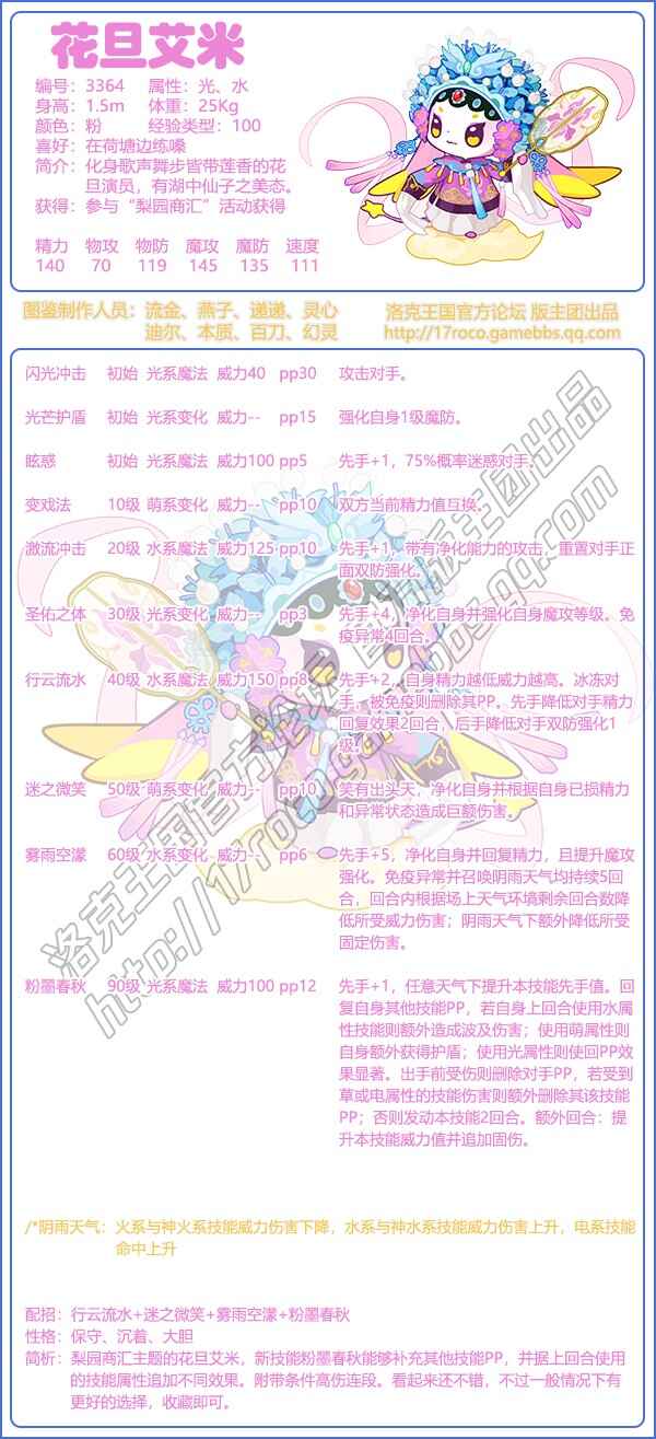 洛克王国花旦艾米技能搭配配招:行云流水+迷之微笑+雾雨空濛+粉墨春秋。