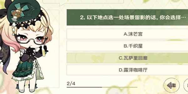 4、问题2:以下地點选一处场景(changjing)留影的话,你会(nihui)选择…【C、瓦萨里回廊】。