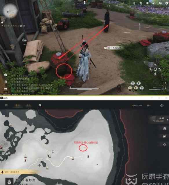 2、接着就在(at)万贯旁边的酒坛堆,找到第一枚慈心山院花钱,拾取之后继续和万贯进行对话。