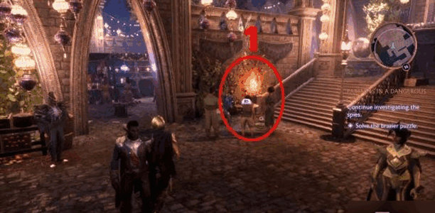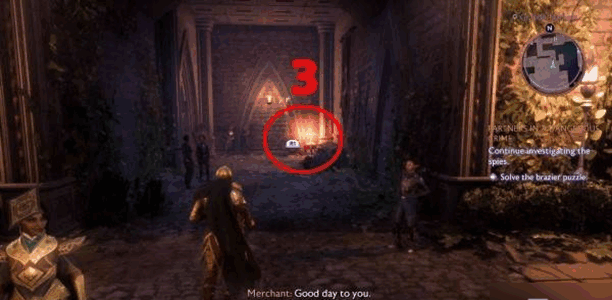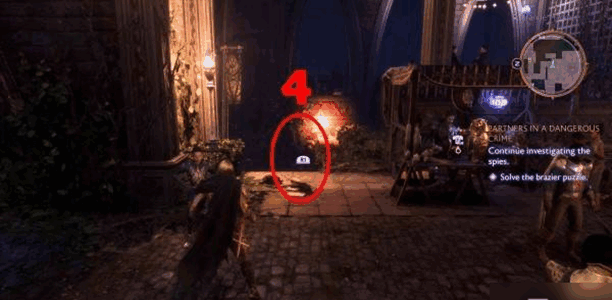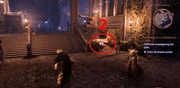 3、去格兰德市(shi)场,做【继(ji)续(xu)调查间谍】任务(wu)时,先跟着提示(shi)找线索,然后解个火盆谜题。