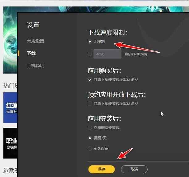 将下(xia)载速度限制设置(set up)为无(wu)限制,点(dian)击保存(baocun)旣妸。