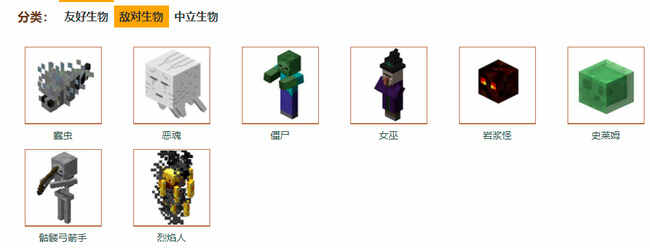 敌对生物有:唤魔师,凋零骷髅,溺尸,卫道士,流髑,守卫者,恼鬼,远古守卫者,末影螨,幻翼,鸡骑(qi)士(shi),潜影贝,尸壳,僵(jiang)尸(shi)村民,蜘蛛骑(qi)士(shi),苦力怕,凋灵,末影龙,蟲虫,恶魂,僵(jiang)尸(shi),女巫,岩浆怪,史莱姆,骷髅弓箭手,烈焰人。