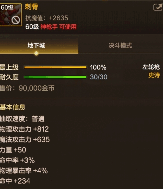 地下城与勇士(DNF)手游中的60级史诗左轮枪“刺骨”是神枪手职业的一种强力武器。以下是该武器的基本信息介绍: