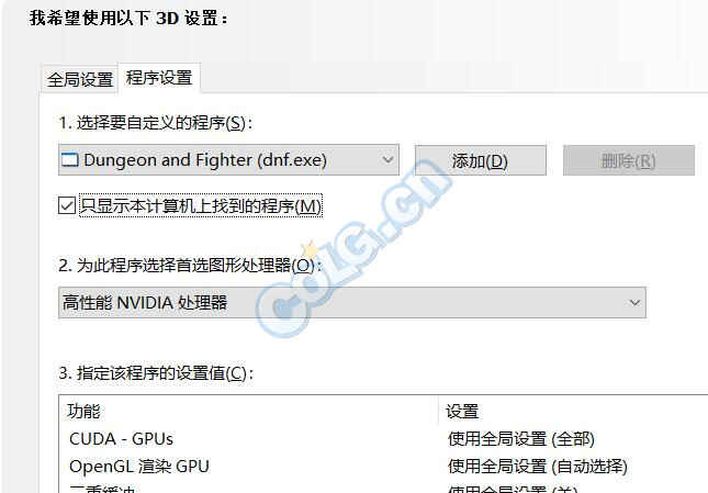 首先是N卡player玩DNF常用的设置:全局高性能+DNF高性能