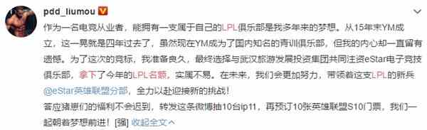 12月12日知名电竞人PDD微博官宣竞标得到LPL职业联赛席位,将带(dai)领新兵eStar英雄联盟分部 于2020赛季征战LPL赛场。