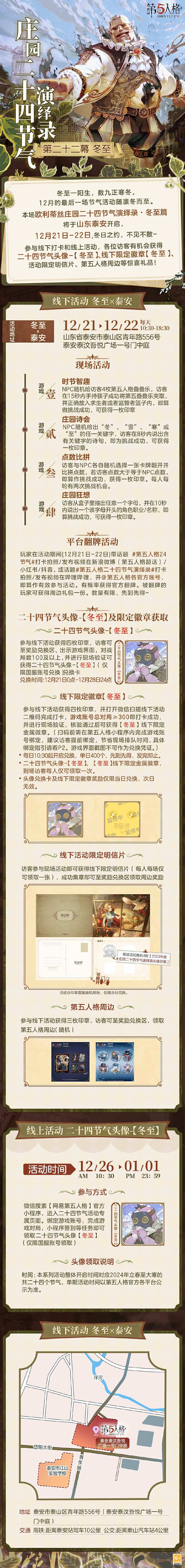 参与(yu)现场活动,各(ge)位(wei)访客有机会获得二十四节气头像-【冬至】兑换卡、线下限量徽章【冬至】、线下活动限定明信片、第五人格周边等丰富奖励~