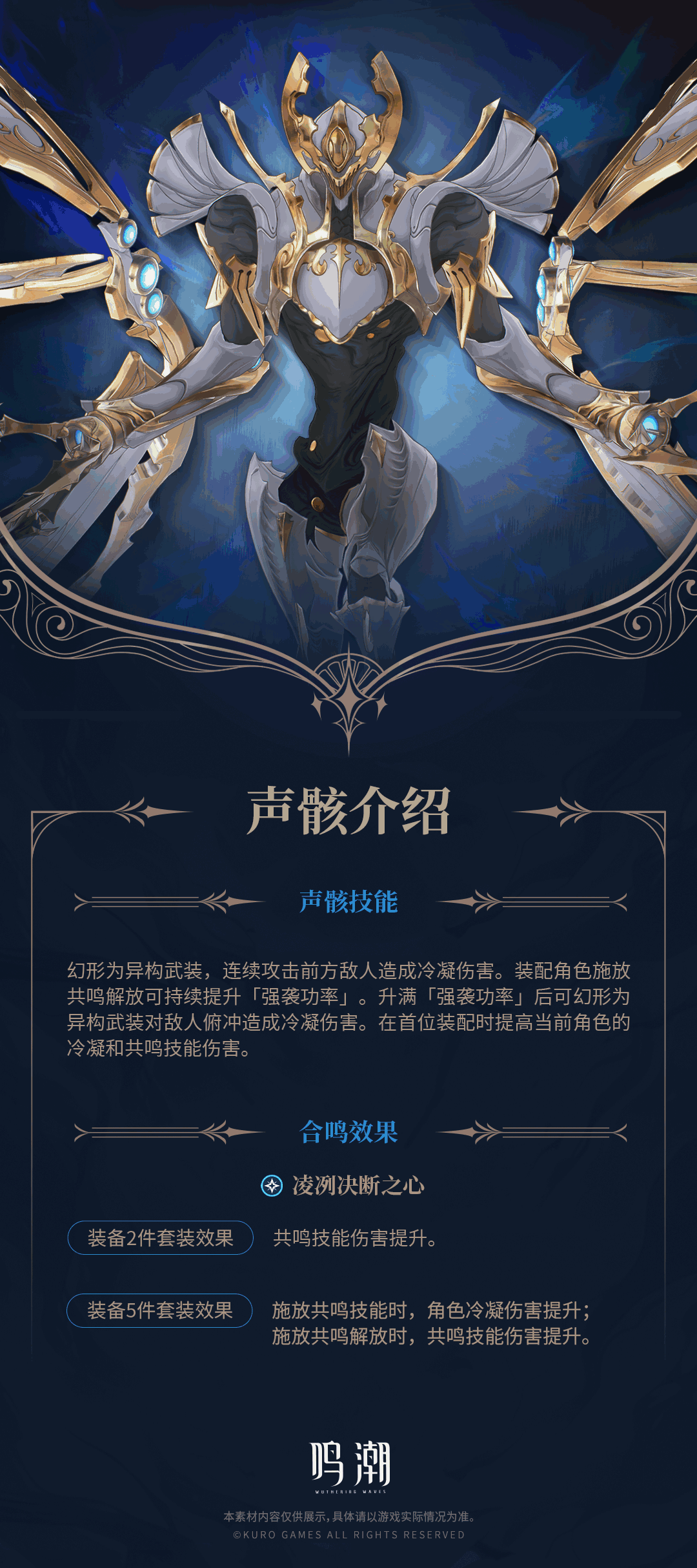声骸技能幻形为异构武装,涟續攻击前方敌人造成冷凝傷害。装配角色施放共鸣解放可持续提升「强袭功率」。升满「强袭功率」后可幻形为异构武装对敌人俯冲造成冷凝傷害。在首位装配时提高当前角色的冷凝和共鸣技能傷害。