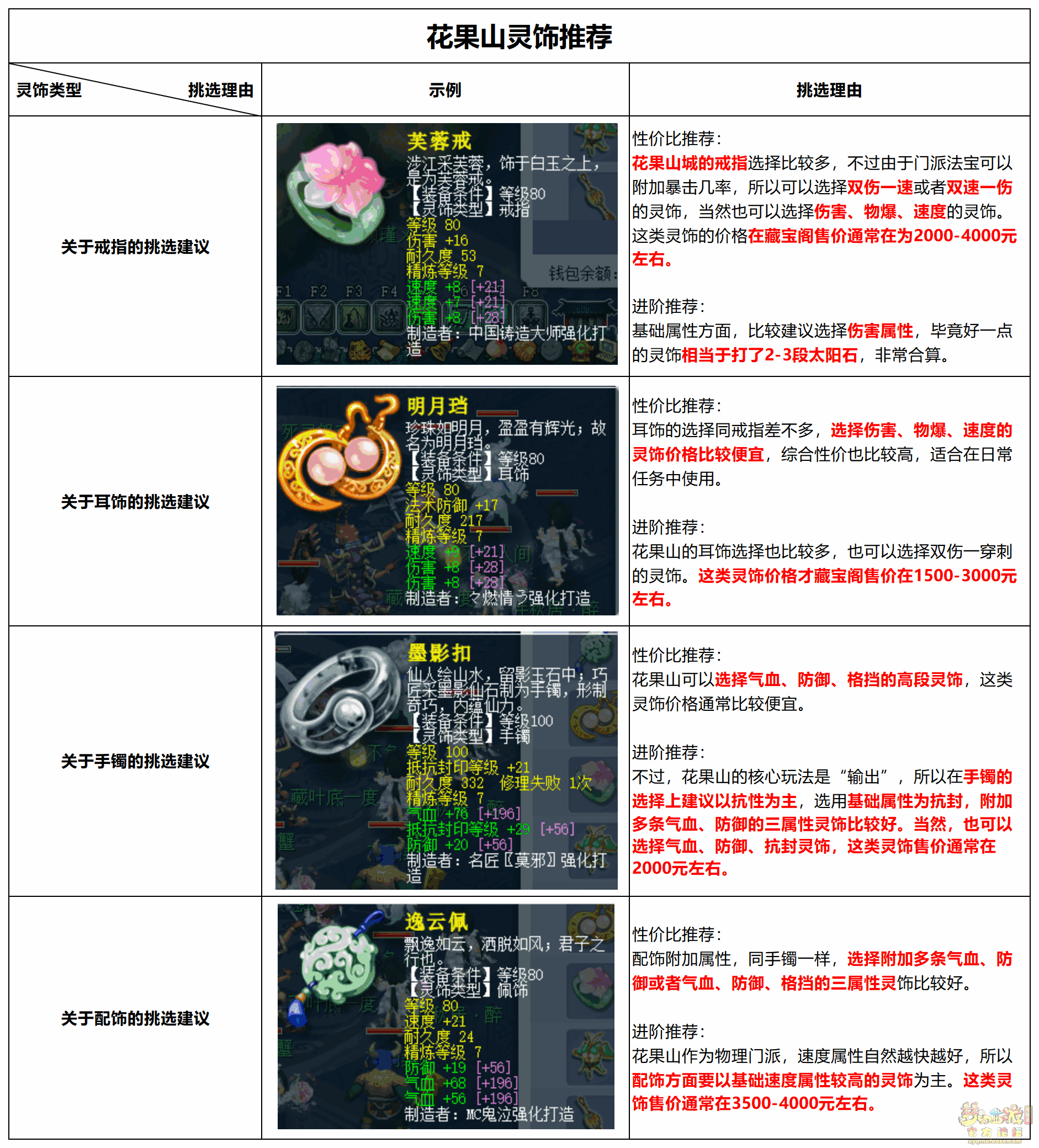 对于花果山来说,灵饰方面的选择肯定是以輸出、抗性为主。通常建议选择附加多条伤害、速度的前排灵饰和附加气血、防御属性的后排灵饰。挑选的时候要注意灵饰樭绌属性,灵饰细节越好,保值性、流通性就越高(higher)。具体(ti)如下: