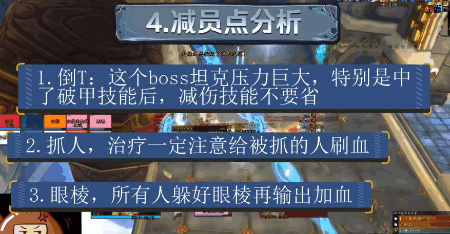 这场战斗(dou)主要(yao)有3个减员点需要注意,第(di)一是倒T,这个(ge)BOSS的坦克压力巨大,特别是中了破甲技能以后,减伤技能千万不要省,第二就是(shi)抓人治疗,一定要注意给被抓的人刷血,第三是眼棱,这么简单的东西应该不会有人不会躲吧。