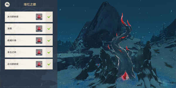 实际上,绯红之愿是大家们将忍冬之树供奉到8级之后开启(turn on)的全新玩法,將會在雪山地图上刷新出5个点位的任务,大家们湔暀点位后完成挑战(zhan)或者杀敌任务旣妸。
