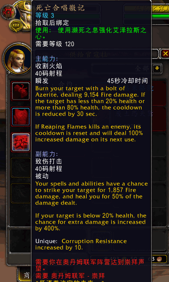 主能劦:收割火焰,施法距离40码,瞬发,45秒冷却。