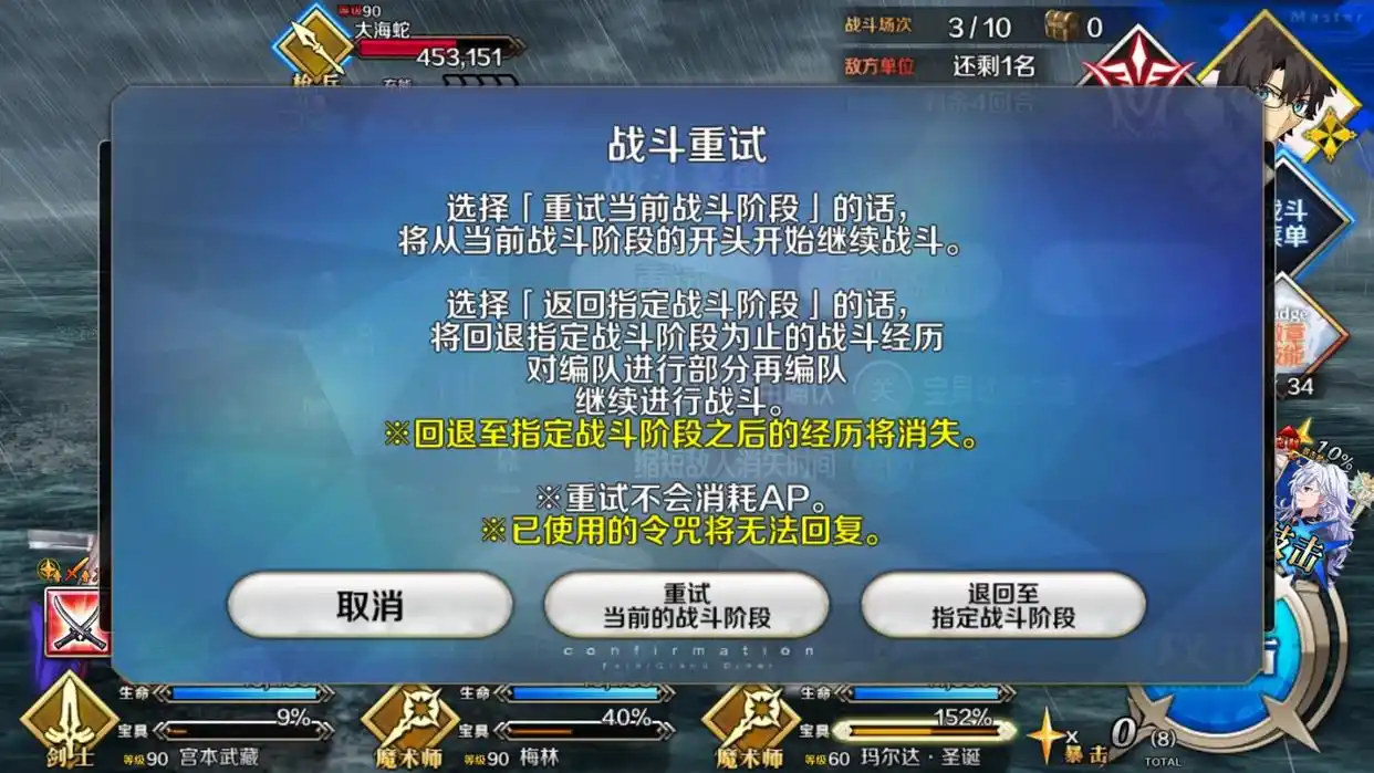 选(xuan)择(ze)【重试当前的战(zhan)斗阶段】之后,可以回退到当前关卡的第一回合,用过的技能会回退,也就是说,如果(ruguo)你想(xiang)要打出最速通关,但是这一面的伤害不达标,但是稍作调整就能解决的话,可以用这个功能。