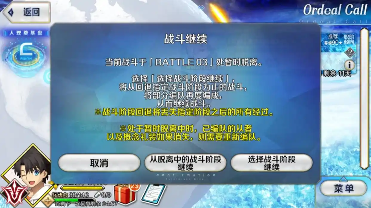战(zhan)斗菜单第二个选项是【暂时脱离】,就是你想(xiang)要强化一些从者或礼装,或者是中途想打其他关卡的话,就可以暂离去做其他事情之后再回来,回来之后依旧是2个选项可以选(xuan)择(ze),第一个是从脱离的战(zhan)斗继续,也就是说如果(ruguo)你在第5关的话,就继续打第5关,而如果(ruguo)你想从第3关開始打,可以选(xuan)择(ze)第三个选项,也就是选(xuan)择(ze)战(zhan)斗阶段继续。