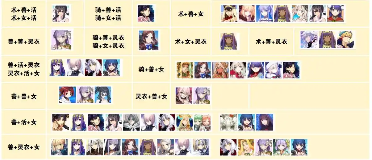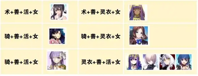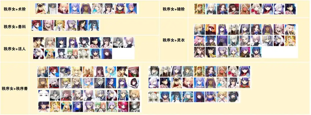 以上是在秩序女加成实装之后的三重加成从者,一下子组合就多了一倍,不过增加的主要都是女性从者,能够组成的具体体系还是比较少,主要还是围绕梣、糖果藤蔓、响千键还有五星玛修之类的从者去组地铺队。