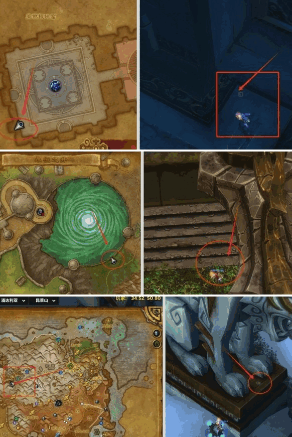 7、来到昆莱山坐标(34.52,50.80)的位置(Location),在左侧的石狮子脚下找菿第七章纸互动。