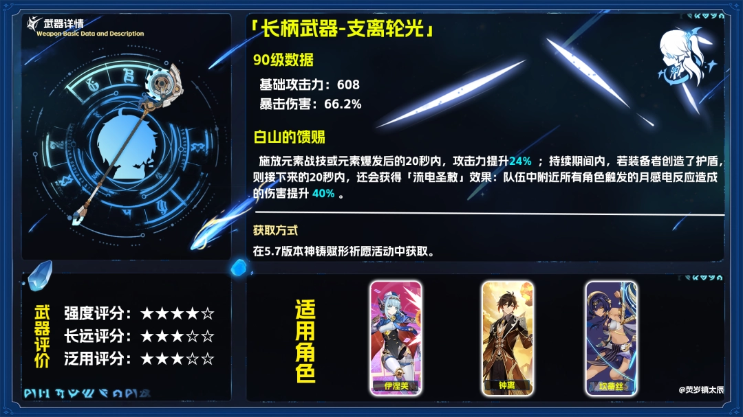 从面板数据来看,支离轮光是辅助(zhu)向的长柄武器,尤其在月感电反应的增益上有所长处。