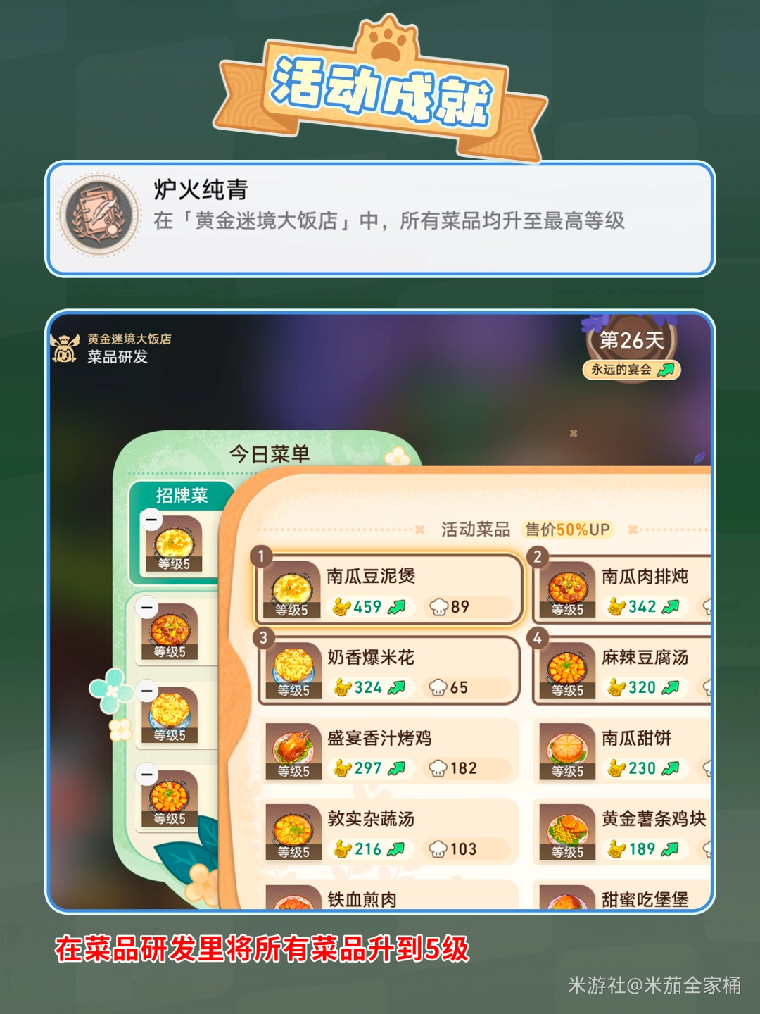 完成(cheng)方(fang)法:在活(huo)动(dong)【黄金(gold)迷境大饭店】中,所有菜品均升至最高等级