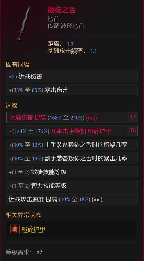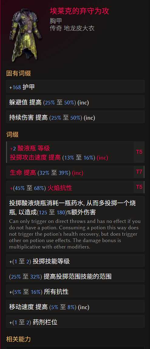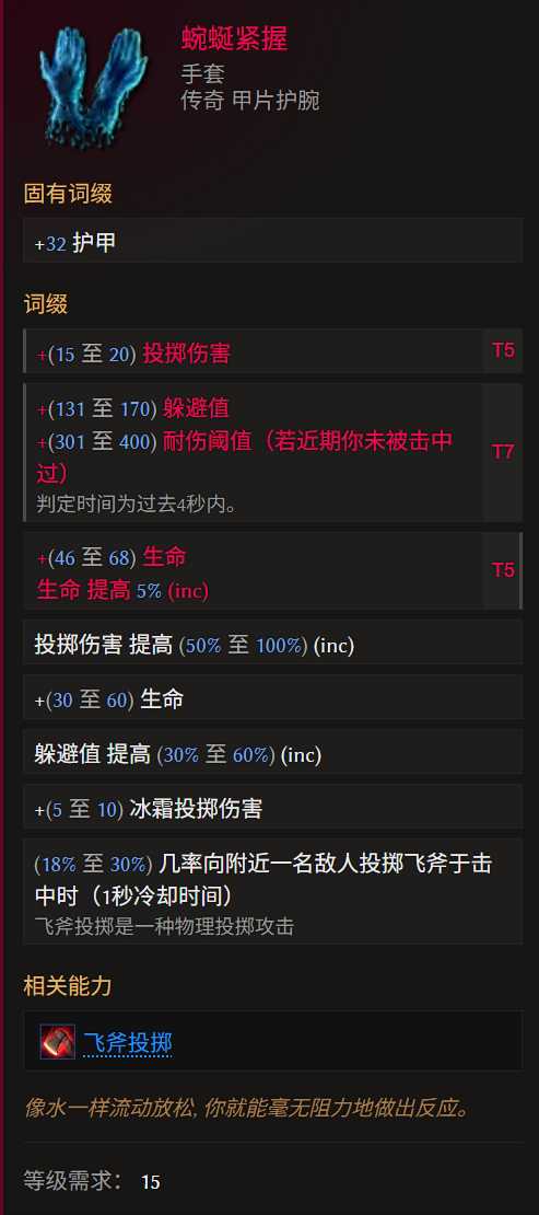 词缀优先级:投掷伤害>魔力再生>躲避inc>生命=火焰抗性(可封印击中虚弱)