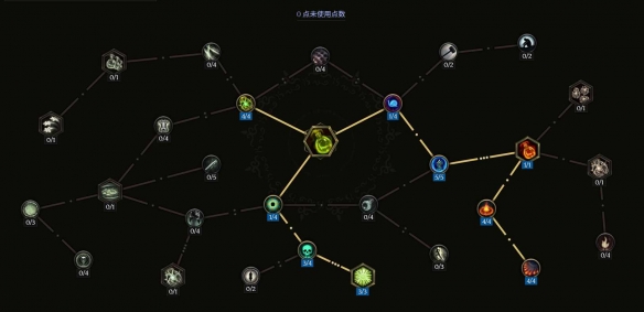 酸液瓶:主技能,技能点不够去除四点钟方向的投掷点伤,装备没有致盲词条点出七点钟方向的致盲概率