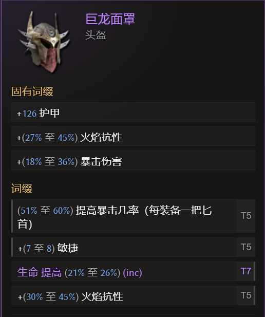 基底:巨龙面罩(提供火焰抗性+暴击伤害,薄纱一切暗金)