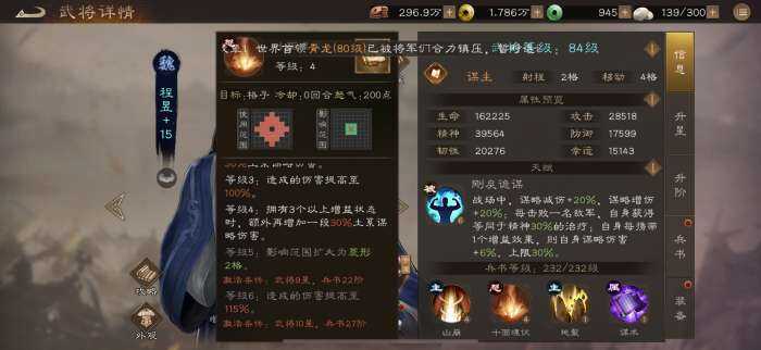 2、从技能方面来看,程昱作为土系法师,技能伤害十分可观。“山崩”技能能够造成大量谋略伤害,并且还能溅射伤害周围敌军,在面对敌方密集站位时,能对多个敌人同时造成打击,迅速压低敌方血线;“地裂”技能则造成范围谋略伤害,且在释放技能前会给自己加2个增益,这为程昱快速叠加增益效果提供了便利,进而提升(promote)他的输出伤害。他的怒气技能“十面埋伏”更是强大,不仅造成范围谋略伤害,在有增益时还能多造成1段30%伤害,当增益达到3个以上时,更是能额外造成2段30%伤害,这使得程昱能够利用多段攻击去攻打具有格挡、闪避属性的BOSS,有效突破敌方防御。