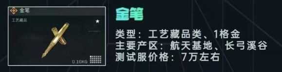 金笔:工艺藏品1格金,实际(ji)价(jia)值(zhi)7万左(zuo)右(you)产量和功绩徽章相当(quite)。