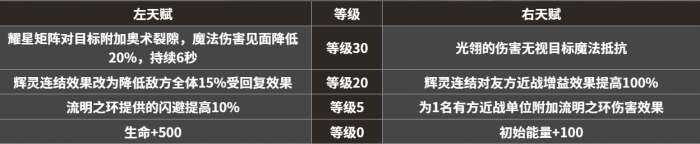 在天赋系统的构建方面,0级时大家可选择增加500点生命值或提升100点初始能量,以适应不同战(zhan)术需求。5级时的两个分支分别为强化流明之环的闪避概率(提升10%)或扩大其范围伤害效果。到达20级后,辉灵连结可转化为削弱敌方治疗能力,或转而提升队(dui)友(you)近战类增益效果100%。当角色成长至30级,天赋将琎①荹优化:一是让耀星矩阵附加奥术缝隙状态,降低目标(Target)20%的魔(mo)法伤害减免;二是使光翎技能完全无视敌方的地热能魔(mo)法抗性,确保技能命中后可造(zao)成(cheng)全额伤害。