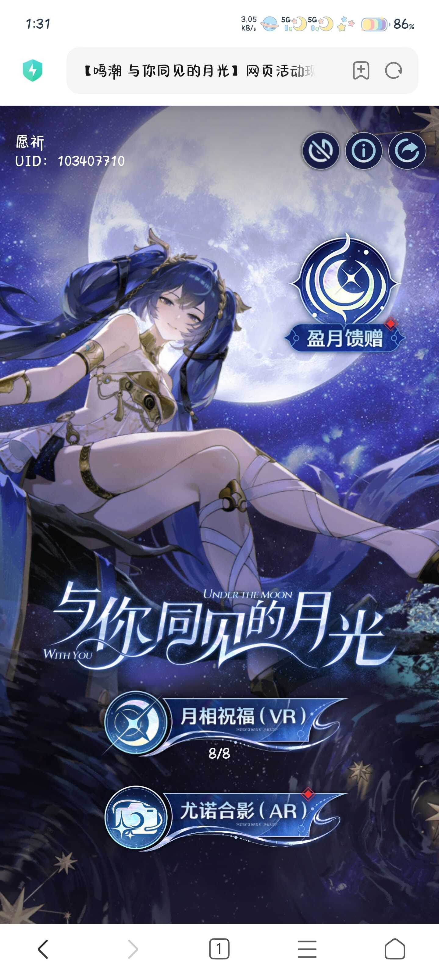·在「月相祝福」玩(wan)法(fa)中,漂泊者可经过VR功能扫描画面中的月亮获得相应的月相祝福,并解锁相应的尤诺AR合影动作。