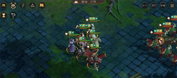 第一(diyi)回合刘备开辅(fu)助,诸葛亮前进开借东风技能,李儒上前开毒技,夏侯渊、吕布开群攻技能,貂蝉再动诸葛亮开八卦阵技能斩杀所有小关羽。