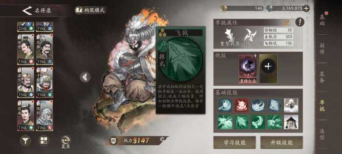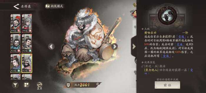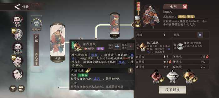 许褚第二个神技就是【裸衣鏖战】,能给对面上50%的物抗消减,这技能在打单体boss的时候非常好用,再加上【裸衣】是区别红色debuff和绿色的buff,也不会被抵抗和祛除,还能辅助第一策略卡天降奇兵的物攻。