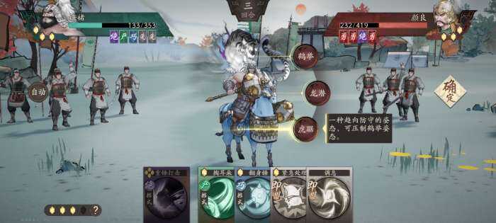 角色每次战斗前可以选择三种姿态,鹤举、龙潜、虎踞,其(qi)中大部分情况下鹤举克龙潜,龙潜克虎踞,虎踞克鹤举,因为每个姿态下又分了多种攻击方式——反击、招架、暴击、攻击、连击、爆气,这之间(between)有克制关系。这边有个误区,并不是一直龙潜攒怒气靠技能打伤害,这模式一旦被克制不仅不能自己回怒气,反而会让对面会怒气。