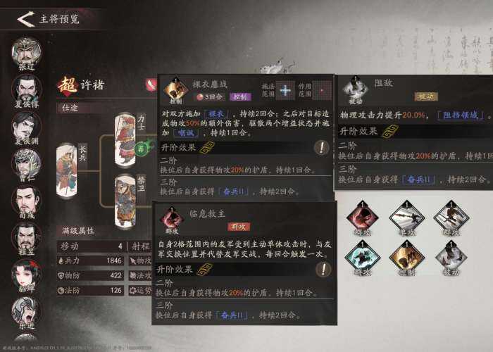 许褚的【临危救主】相当于一次性的援护效果外加换位,这个被动技能在ai自动的情况下非常好用,许褚本身的面板不低,换位后还能触发反击被动,不过需要二阶才能给自己施加护盾,算是短板。